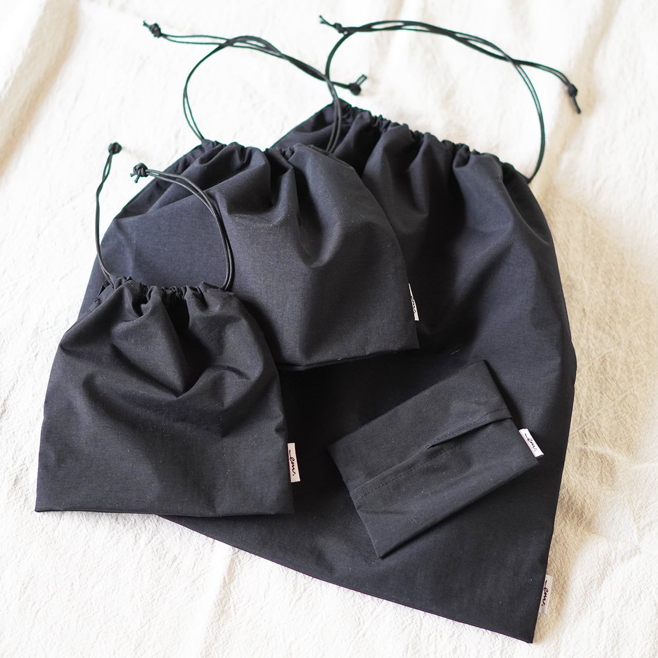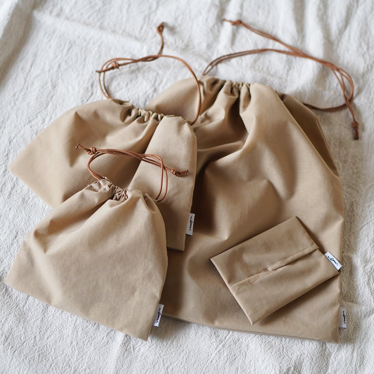 シンプルな巾着袋(3サイズ)とポケットティッシュケースの4点セットです。
