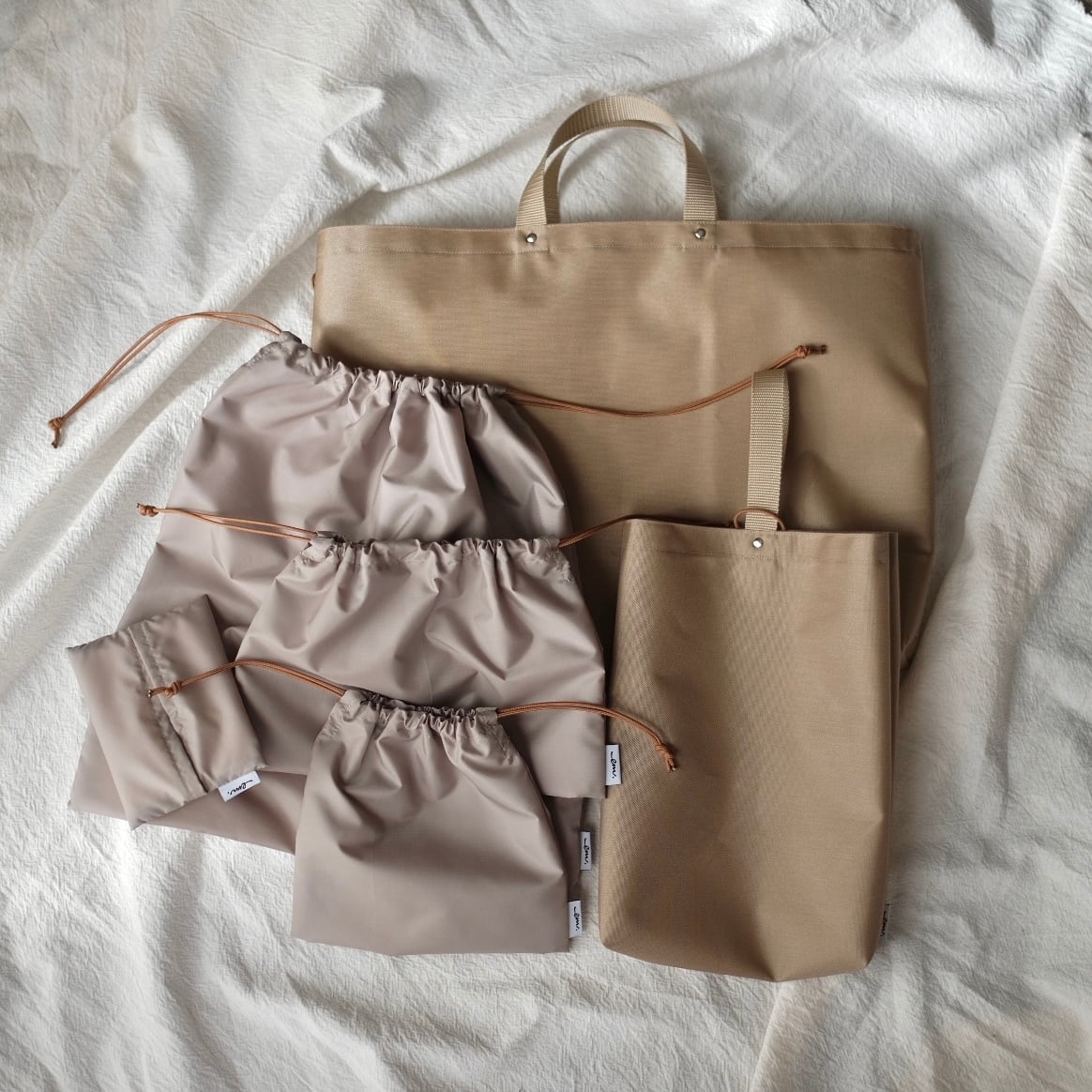 レッスンバッグと上履き入れ、巾着袋(3サイズ)とポケットティッシュケースの6点セットです。