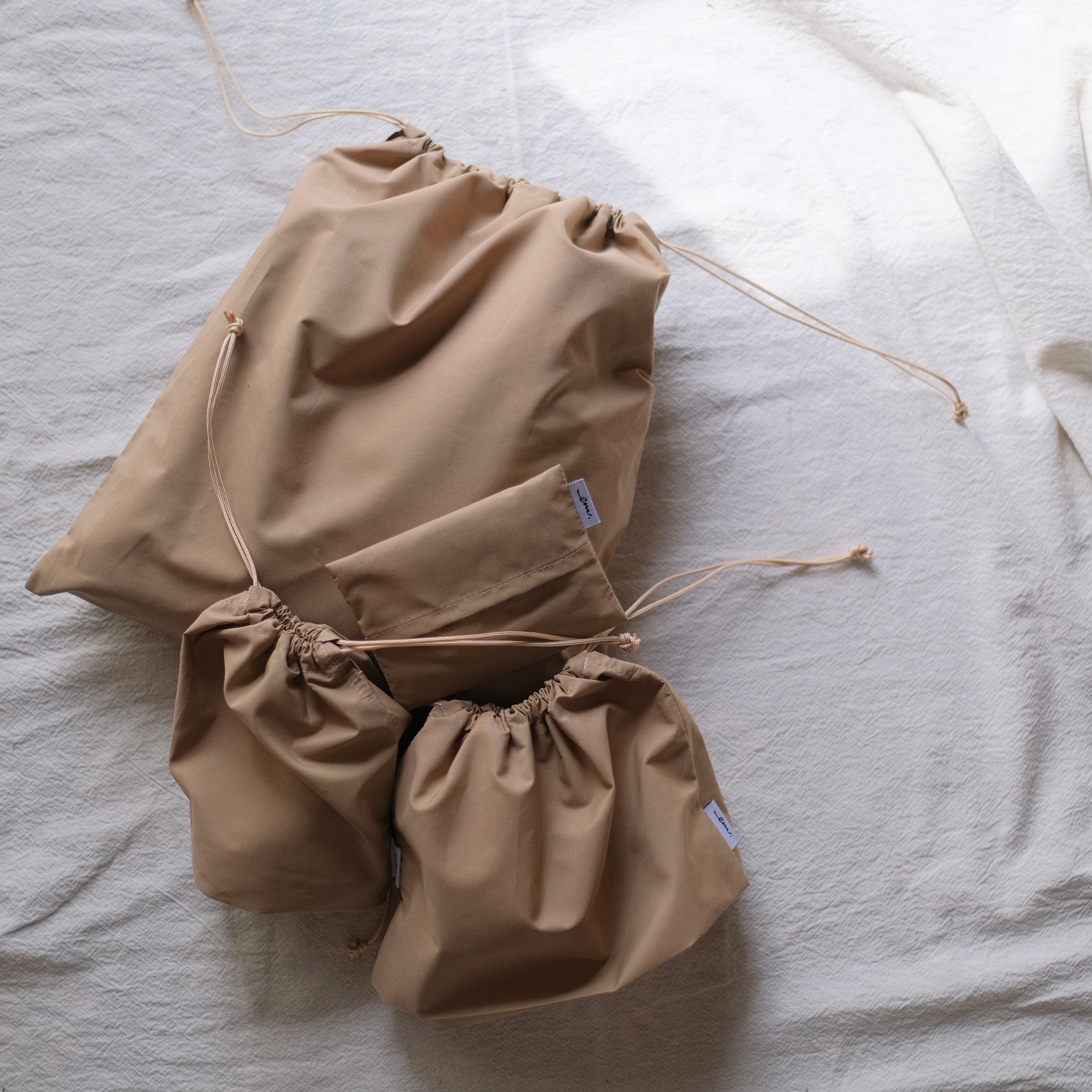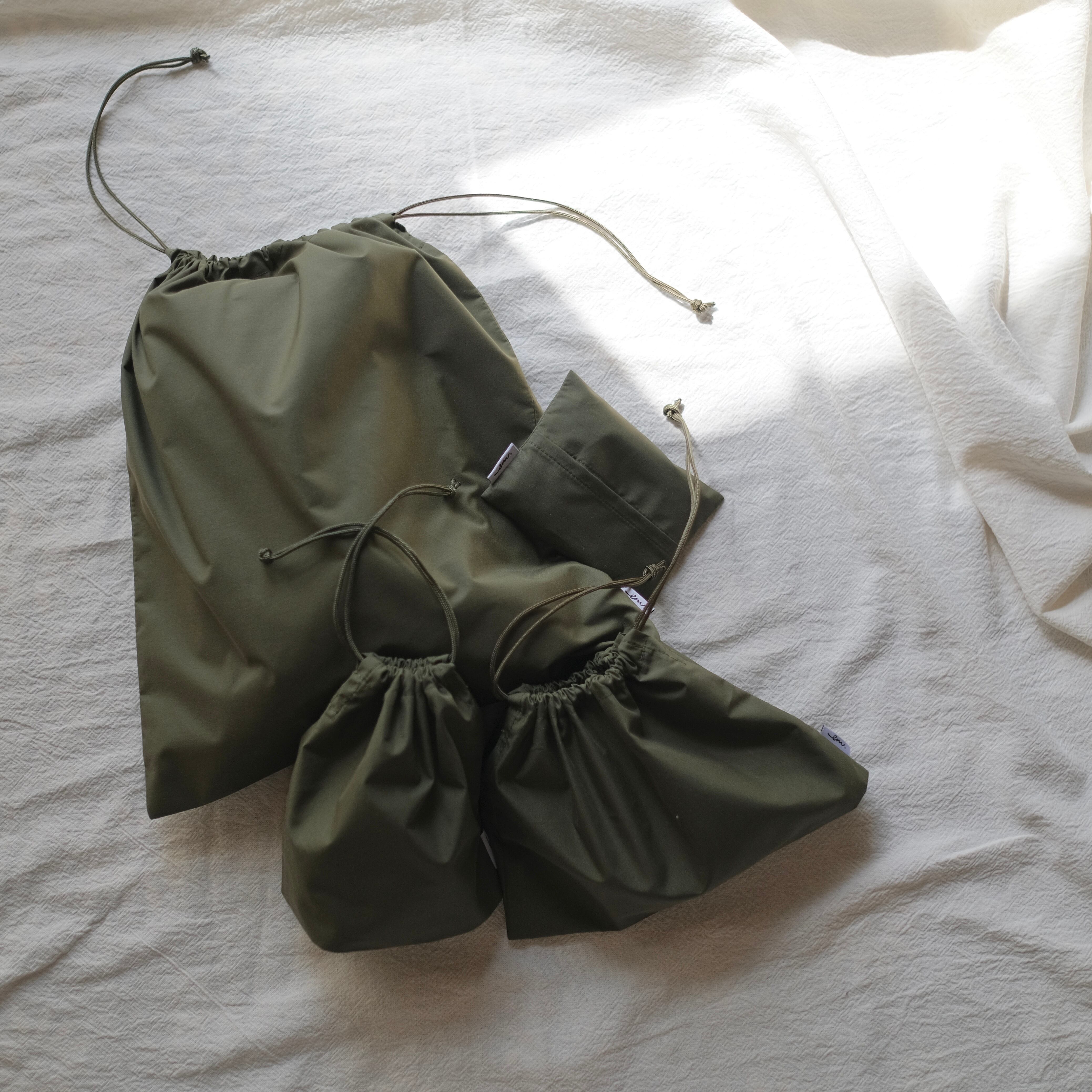 巾着袋(3サイズ)とポケットティッシュケースの4点セットです。